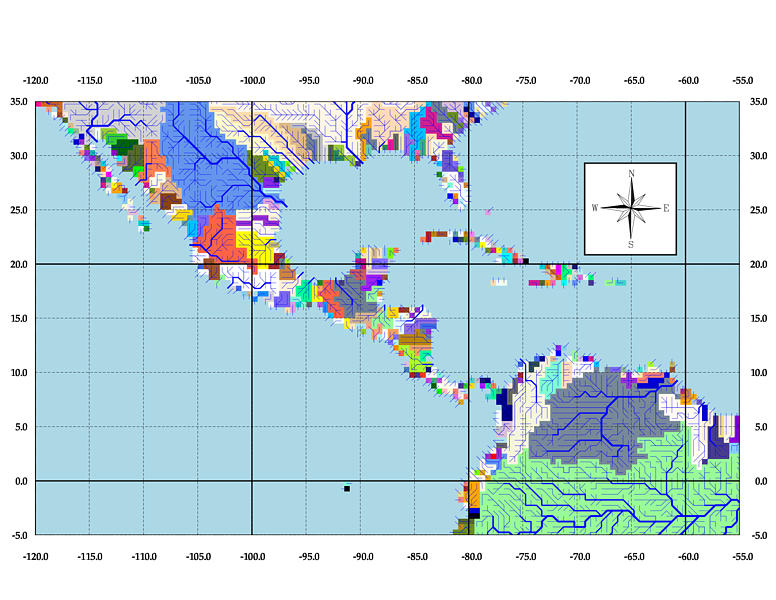 Cada valor representa un número de código para la identificación de la cuenca, para cada pixel de 0,5 grados de resolución. Los valores de -9999 representan datos no disponibles.