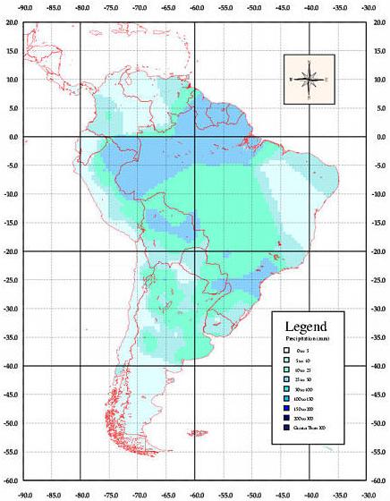 This map is a representation of total monthly precipitation within South America for January of 1960 (GHCN Version 1). This data set is in ASCIIGRID format and can be ingested into Arc/Info software with the ASCIIGRID command or into other geographic information system or cartographic software capable of ingesting a matrix of values to form a raster layer. This data is referenced to a geographic coordinate system and its units are in tenths of millimeters per month. All the data files within the timeseries can be downlaoded by decade in UNIX compressed tar format or Zip file format. The entire gridded time series spans from 1960 to 1990.